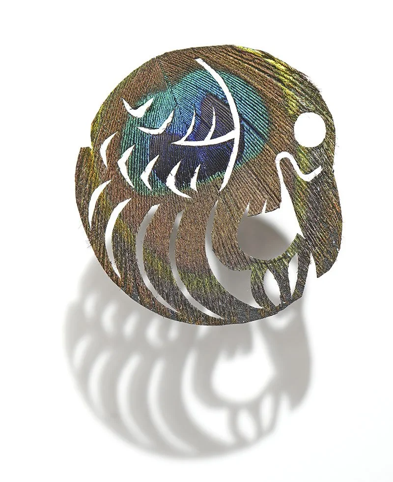 This cut peacock feather is a bit abstract, a little more divorced from my real experience with the birds themselves. I enjoy making these kinds of designs but find it is difficult to incorporate them into larger pieces where I want the inspiration to arise more from my knowledge of, experience with, and respect for the birds themselves. Placing this design on a few black T-shirts, I gave a few to my friends.