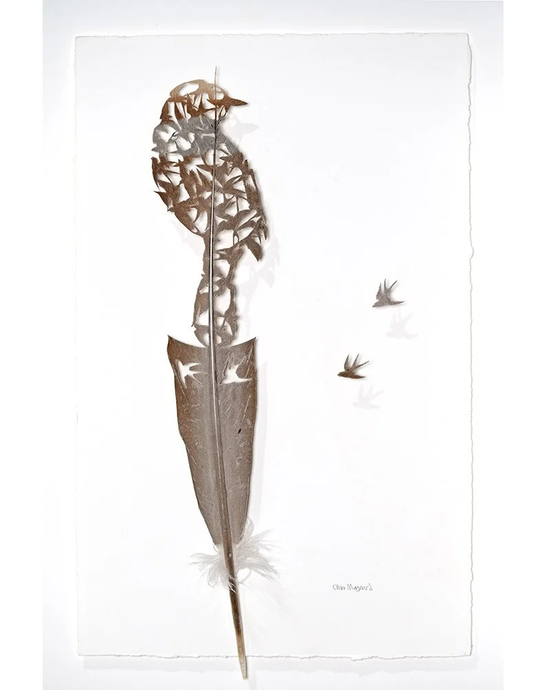 When I use a feather by itself, divorced from the bird, the feather can be a reminder of the bird that wore it. Art does the same thing—it can describe something, say a bird. But the art is not the bird—it’s an abstraction. Civilization seems to be a process of increasing abstraction, breaking things down into their component parts and reassembling them to suit our needs. Like writing for instance, breaking down sounds into pictures, then syllables, then just individual sounds or letters. And then reassembling them to make meaning and communicate. So then we see the world in the way we describe it—by forming these letters into words and into full thoughts. Feathers though are real in themselves and only one step away from the real bird. So I hope that my work with feathers can be more of a direct connection with the world, a little different and refreshing angle from which to observe the realm.